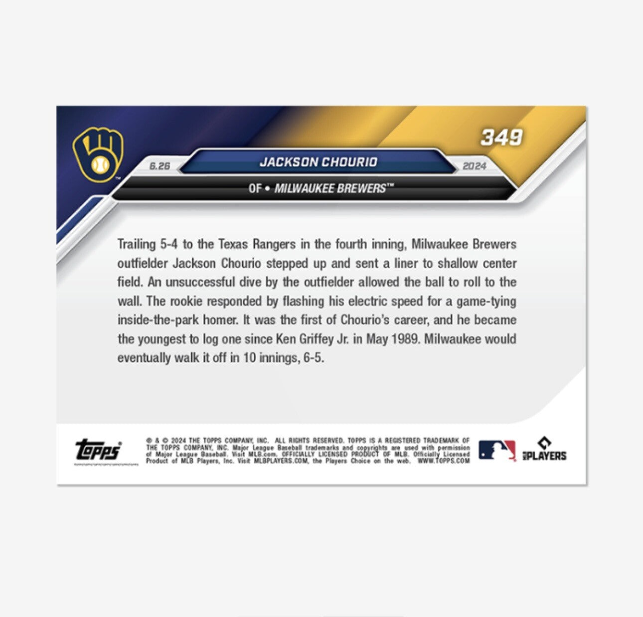 Graded 10 2024 Topps Now MLB #349 Jackson Chourio RC Brewers Rookie Card Baseball