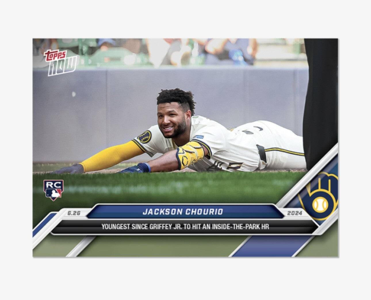 This is a PRESALE 2024 Topps Now MLB #349 Jackson Chourio RC Milwaukee Brewers Rookie Card. The card is a standard size and features a Major League (MLB) player, Jackson Chourio, from the Milwaukee Brewers team. It is a sports trading card manufactured by Topps that is set to be released in 2024 and is part of the 2024 Topps Now series.