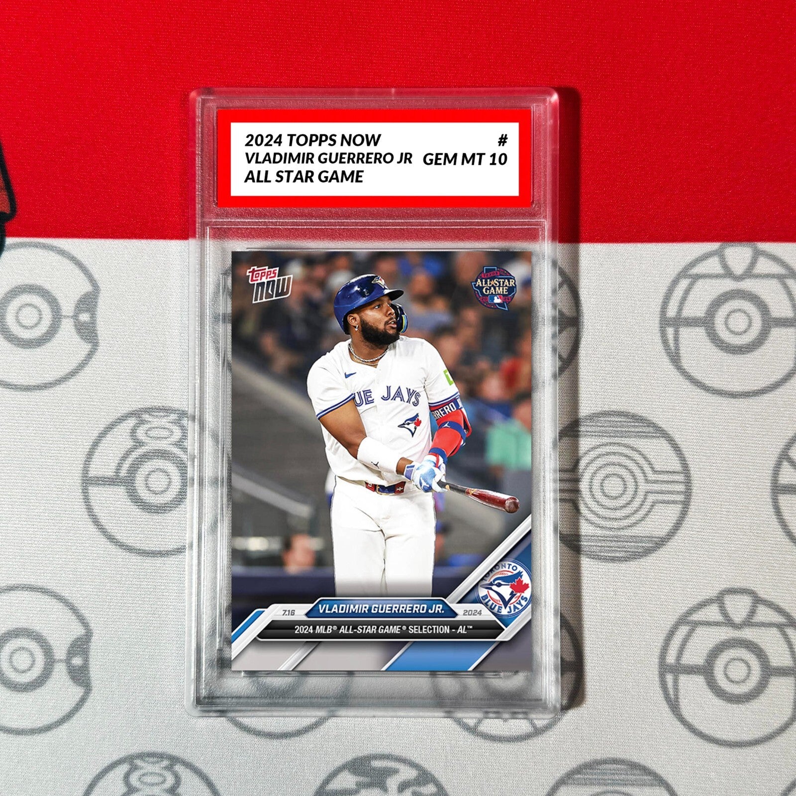 This sports trading card is a must-have for any baseball fan. It features the talented Vladimir Guerrero Jr. of the Blue Jays, from the 2024 Topps Now set. The card has been graded a perfect 10, making it a valuable addition to any collection.