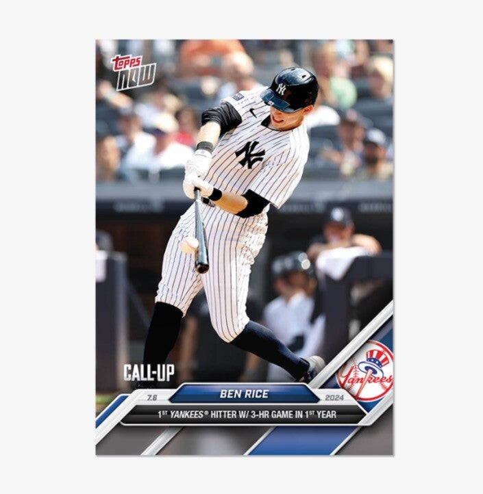 This is a rare opportunity to own a piece of baseball history. The PRESALE Ben Rice Call-Up RC Yankees History 3 HRs 2024 MLB TOPPS NOW Card 388 is a must-have for any serious collector. This sports trading card features a rookie card of Ben Rice, a promising young baseball player who has already made a name for himself.