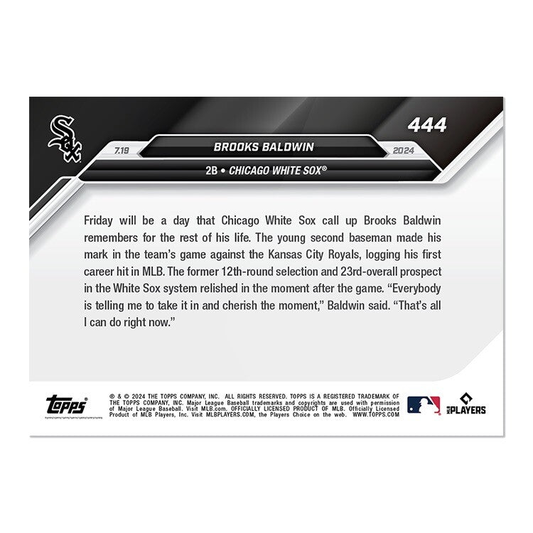 The card is a part of the base set and is a rookie card for Baldwin. It is perfect for anyone who wants to start collecting or add to their existing collection. The card number is 444 and it is from the 2024 season. Don't miss out on this opportunity to own a piece of baseball history.