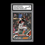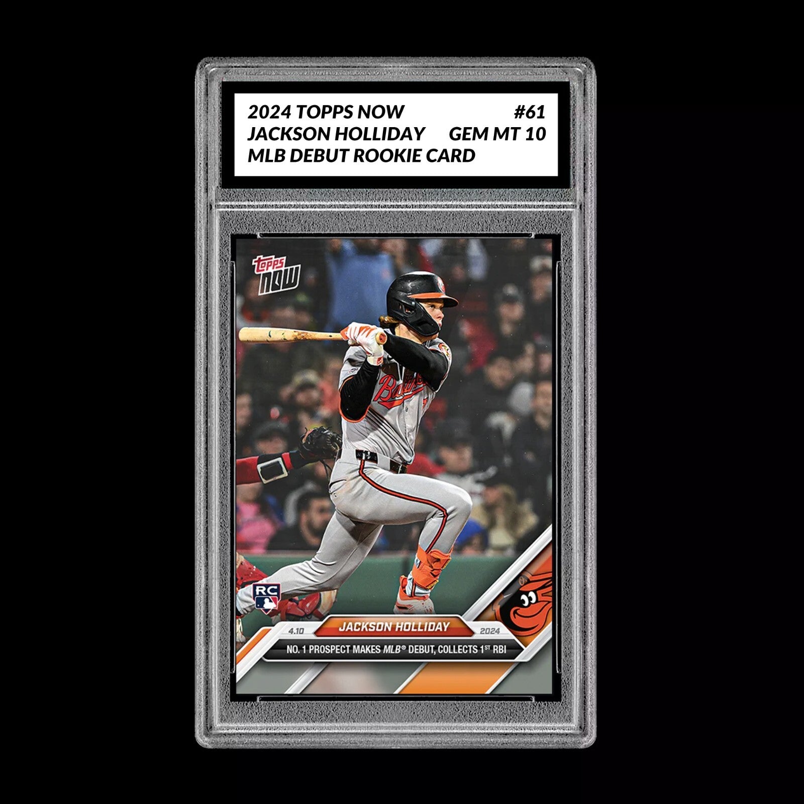 This product is a graded 2024 Topps Now trading card featuring Jackson Holliday, a rookie player for the Baltimore Orioles, marking his first MLB debut and first RBI. The card is a Short Print in the Major League (MLB) set and is part of the standard-sized Topps Now parallel/variety. Manufactured by Topps in the United States on card stock material, this sports trading card is numbered 61 in the set and holds a high grade of 10. It is a valuable collectible for fans of baseball memorabilia and sports trading cards.