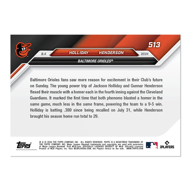 The card number is 513 and it belongs to the category of trading card singles. The season is 2024 and the type is a sports trading card. The manufacturer is Topps and the players featured are Jackson Holliday and Gunnar Henderson. This card is perfect for anyone who loves baseball and wants to add to their collection.