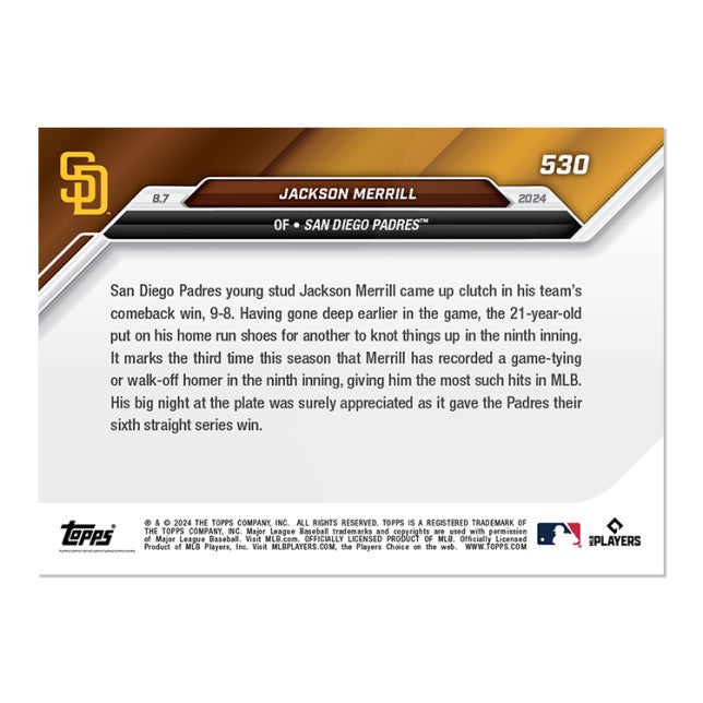 For all baseball fans out there, check out this amazing Jackson Merrill #530 Rookie RC trading card! This card features the young athlete in his 2024 MLB debut season and is a must-have for any collector. Produced by Topps, this sports trading card is of the highest quality and is sure to be a valuable addition to your collection.