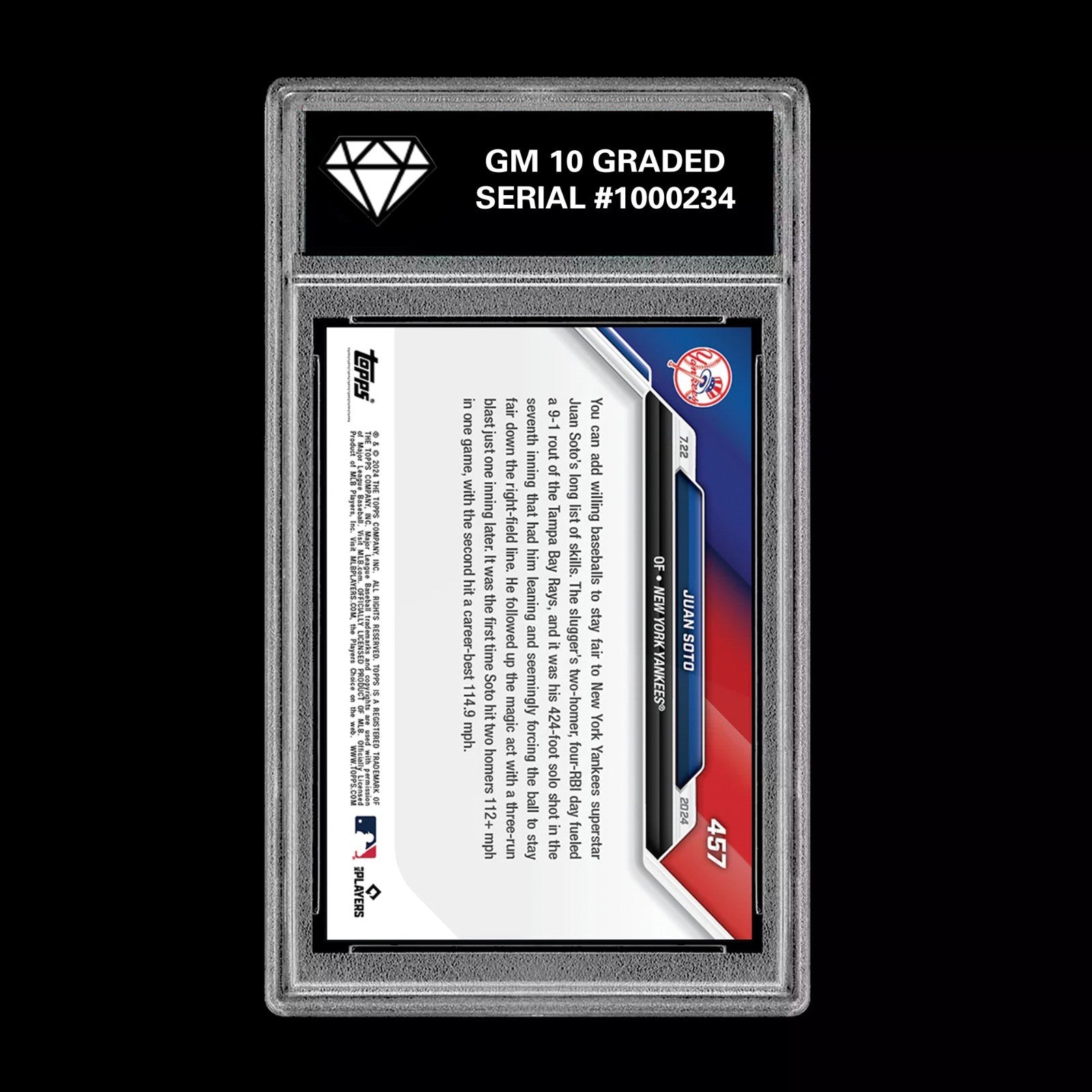 The product is a highly graded 10 Juan Soto 2024 Topps Now #457 trading card featuring the baseball player in his New York Yankees uniform. Released by Topps in the United States, this collectible card is part of the Major League Baseball (MLB) set for the 2024 season. As a sought-after item among sports trading card enthusiasts, this card captures a significant moment in Soto's career with the Yankees, making it a valuable addition to any fan's collection.