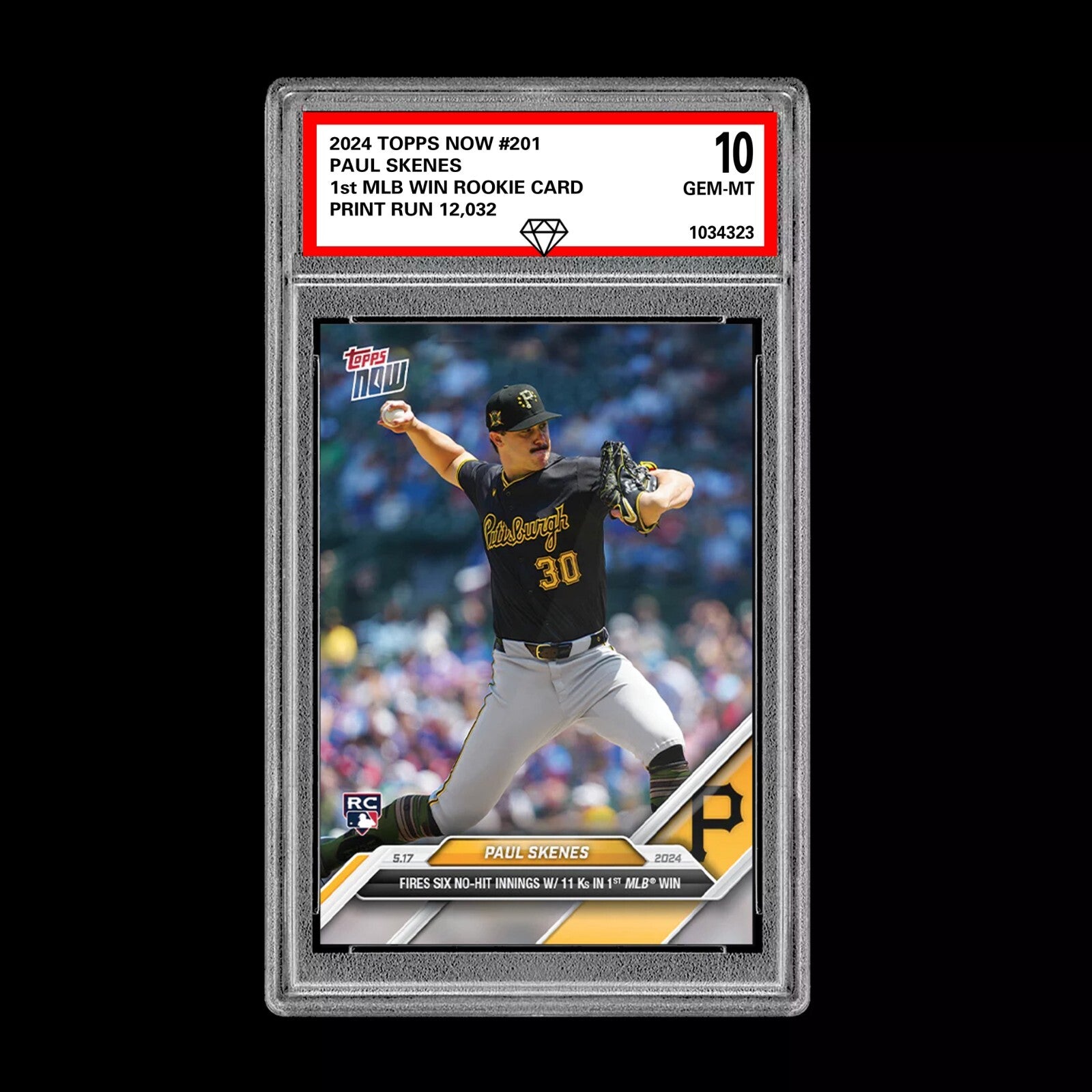 The product is a 2024 Topps Now baseball trading card featuring Paul Skenes, showcasing his MLB debut and first win. This rookie card, numbered 201, has been graded a 10, indicating it is in pristine condition. Manufactured by Topps, this English language card is an original release in the set. It is a sought-after collectible for fans of sports trading cards, especially those interested in rookie cards and milestone achievements in baseball.