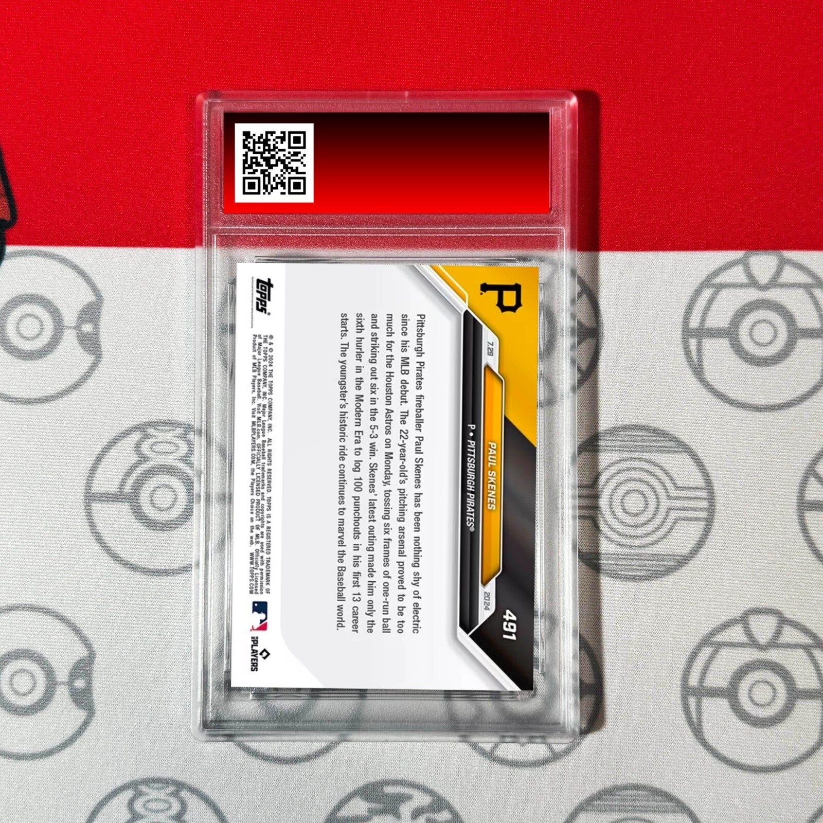 This is a rare opportunity to own a graded 10 Paul Skenes Rookie Card #491 from the Pittsburgh Pirates. This sports trading card is part of the 2024 Topps Now set and features the Major League Baseball player in his rookie year. The card is made of high-quality card stock and has been manufactured in the United States by Topps.