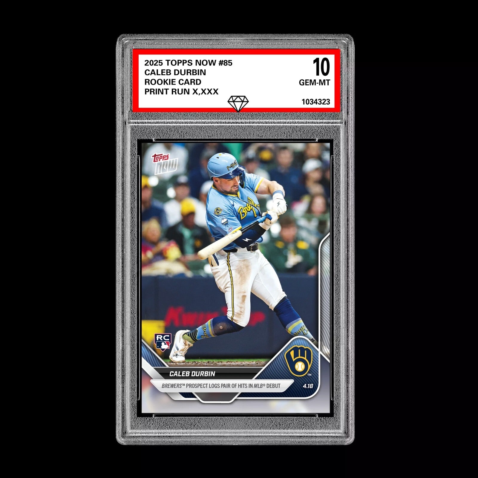 The product is a Caleb Durbin rookie card from the 2025 Topps NOW series, featuring his debut with the Milwaukee Brewers. This baseball trading card, numbered 85, is a highly anticipated collectible for fans and collectors alike. With its limited availability and special features, this presale release is sure to be a valuable addition to any sports trading card collection.