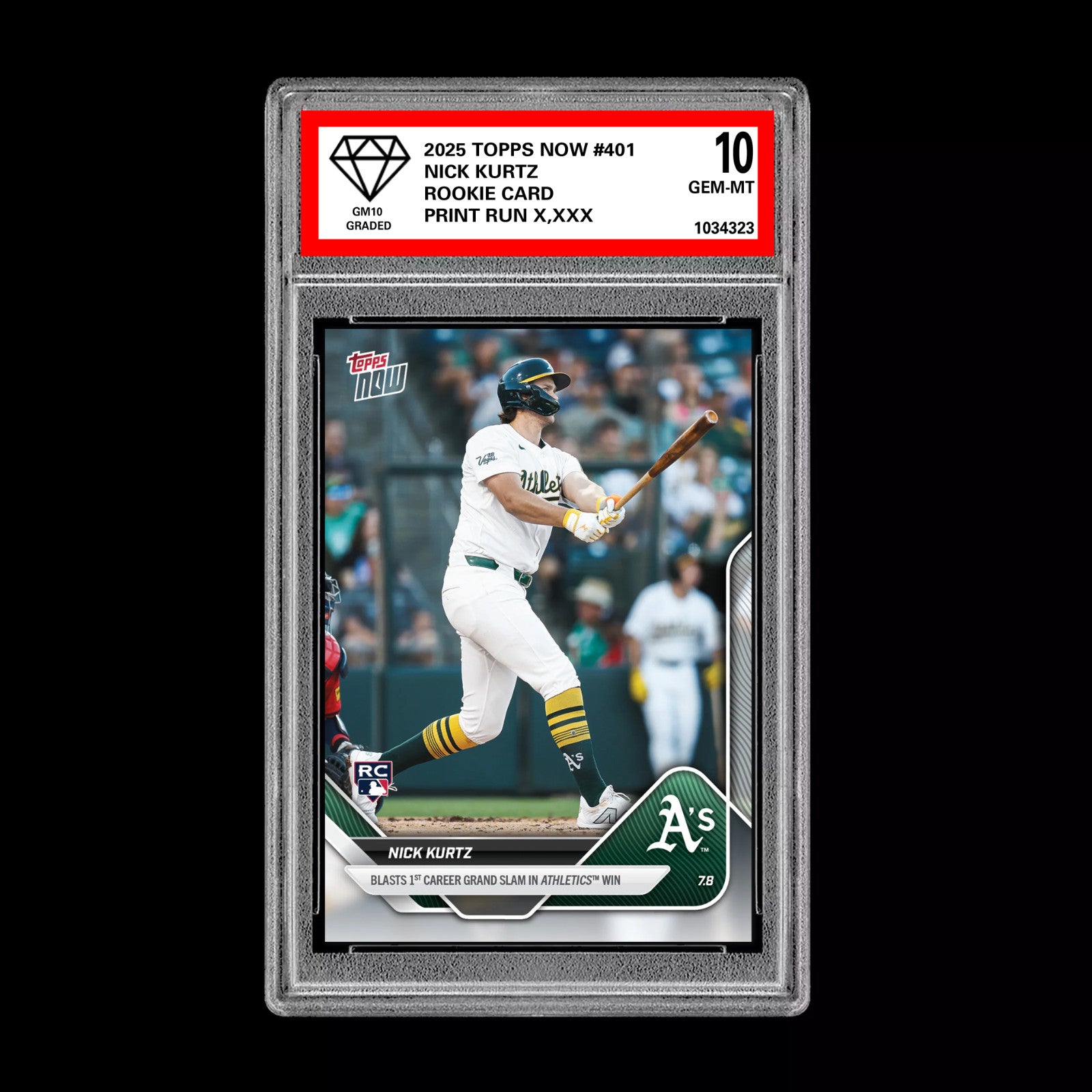 The product is a presale graded 10 Nick Kurtz rookie trading card from the 2025 Topps Now set on the Oakland Athletics. This baseball card features the player Nick Kurtz in his rookie season in Major League Baseball. Manufactured by Topps in the United States, this card is a valuable addition to any sports trading card collection, especially for fans of the Oakland Athletics and baseball enthusiasts looking for high-grade rookie cards.