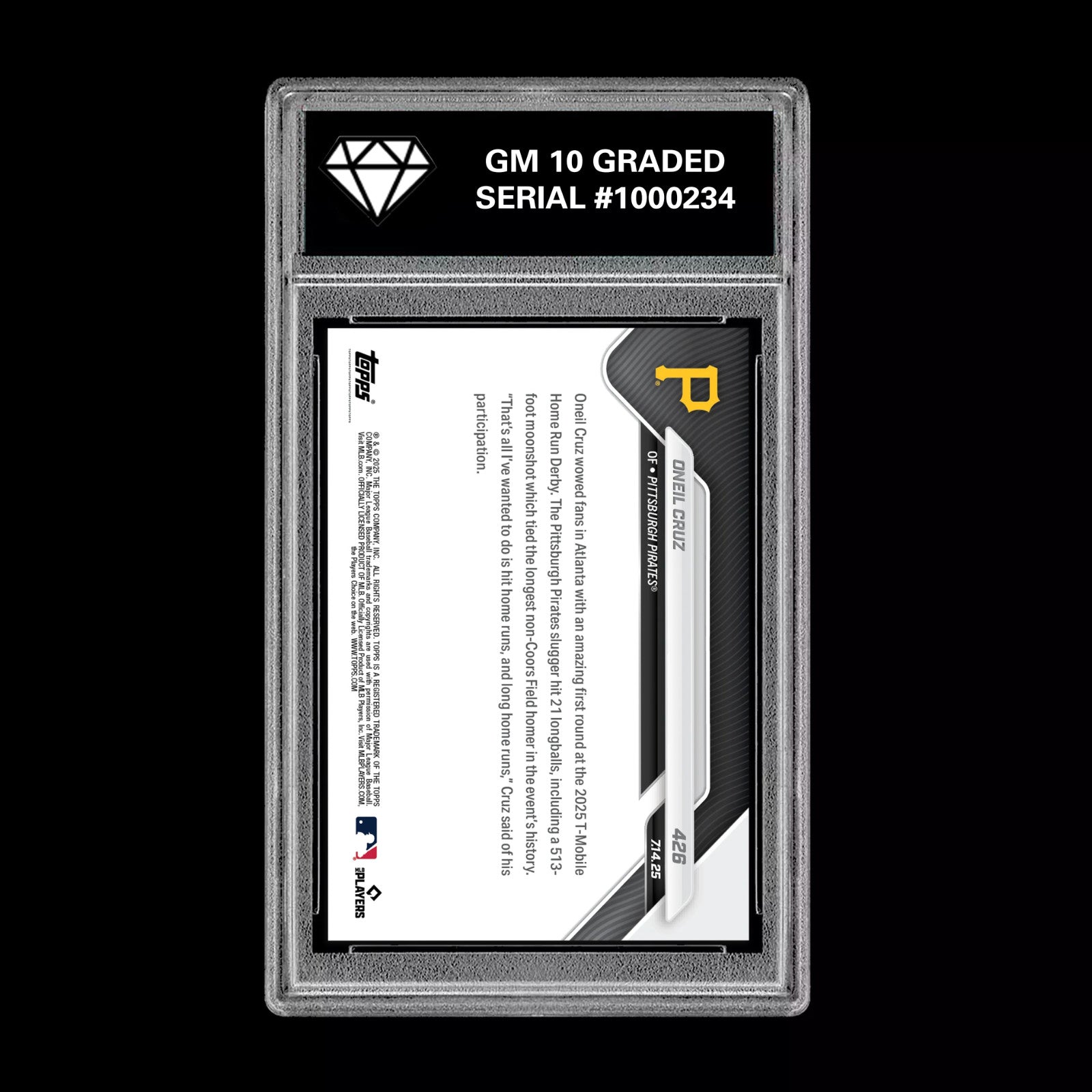 The product is a GRADED 10 Oneil Cruz 2025 Topps Now #426 Home Run Derby trading card. This baseball card features the player Oneil Cruz from the Pittsburgh Pirates, part of the Major League (MLB) for the 2025 season. Manufactured by Topps in the United States, this sports trading card showcases a notable moment in the Home Run Derby competition. A sought-after item for collectors and fans of baseball memorabilia, this card captures a significant achievement by a promising player.