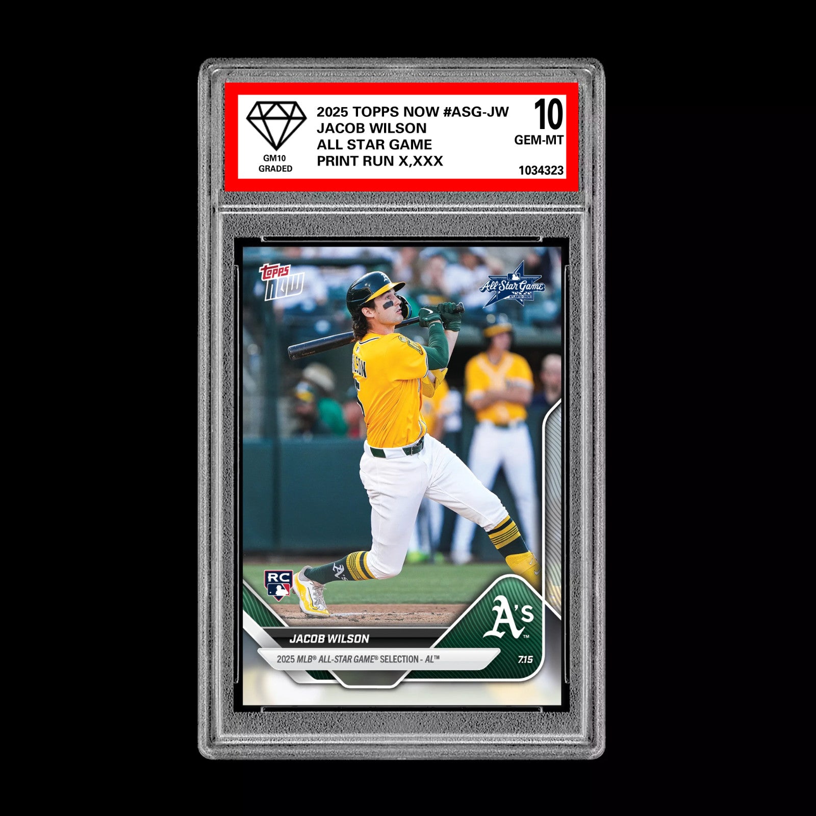 The product is a graded 10 Jacob Wilson baseball trading card from the 2025 Topps Now #ASG-JW All-Star Game set. Manufactured by Topps in the United States, the card features the player Jacob Wilson from the Oakland Athletics, representing the All-Star Game of the Major League (MLB) season. This collectible card is a valuable addition to any sports trading card collection, showcasing a top athlete from the baseball world.