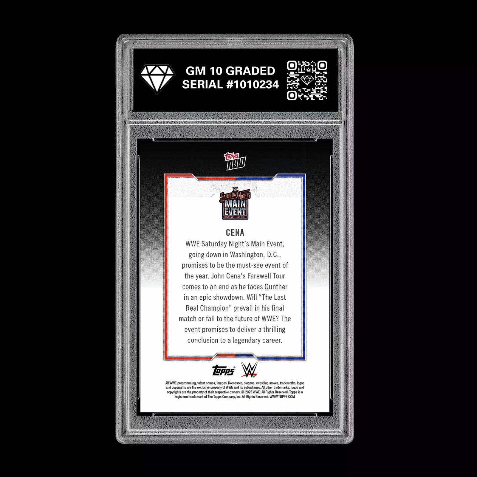 The product is a highly sought-after John Cena 2025 WWE Topps Now trading card, featuring the wrestler in his last real champion form. This limited edition card is graded 10, ensuring its authenticity and collectible value. Signed by Pete Alonso, the card is made of card stock and is part of the 2025-26 Topps set. A must-have for wrestling fans and collectors, this special card captures a memorable moment in WWE history.