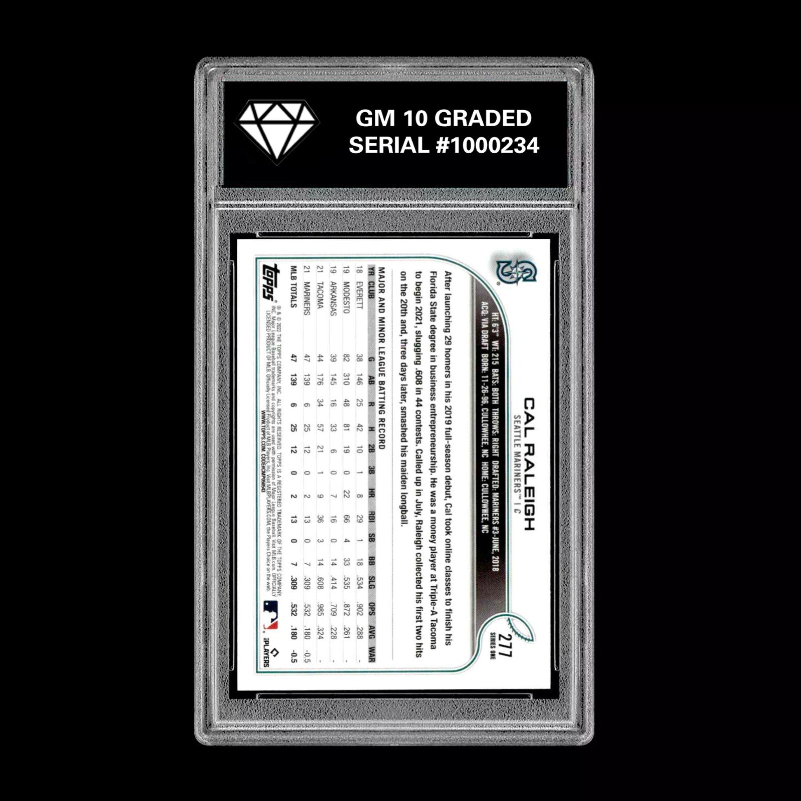 Graded 10 Cal Raleigh - 2022 TOPPS #277 RC Rookie Card Seattle Mariners Baseball
