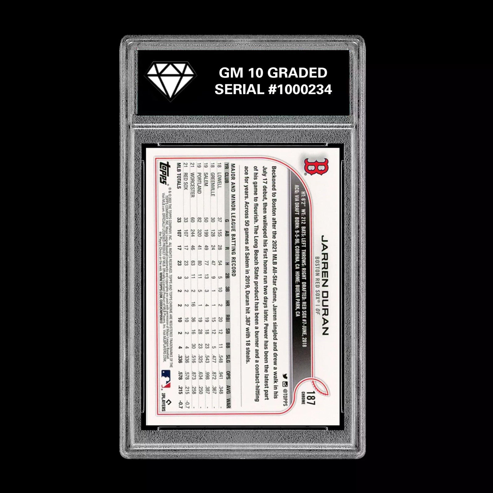 Graded 10 Jarren Duran - 2022 TOPPS #187 RC Rookie Card Boston Red Sox Baseball