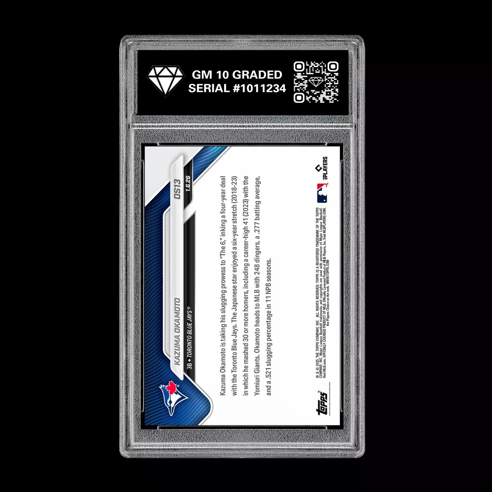 The product is a graded 10 Kazuma Okamoto OS-13 2025 MLB Topps NOW Card presale featuring Tatsuya Imai from the Toronto Blue Jays and Houston Astros. This sports trading card, part of the Major League Baseball series, showcases the player in a standard size card format manufactured by Topps. The card is officially licensed and graded, making it a valuable collectible for fans and collectors of baseball memorabilia. Known for its premium quality and vibrant design, this card captures a specific moment in the 2025 MLB season, making it a sought-after item in the sports trading card market.