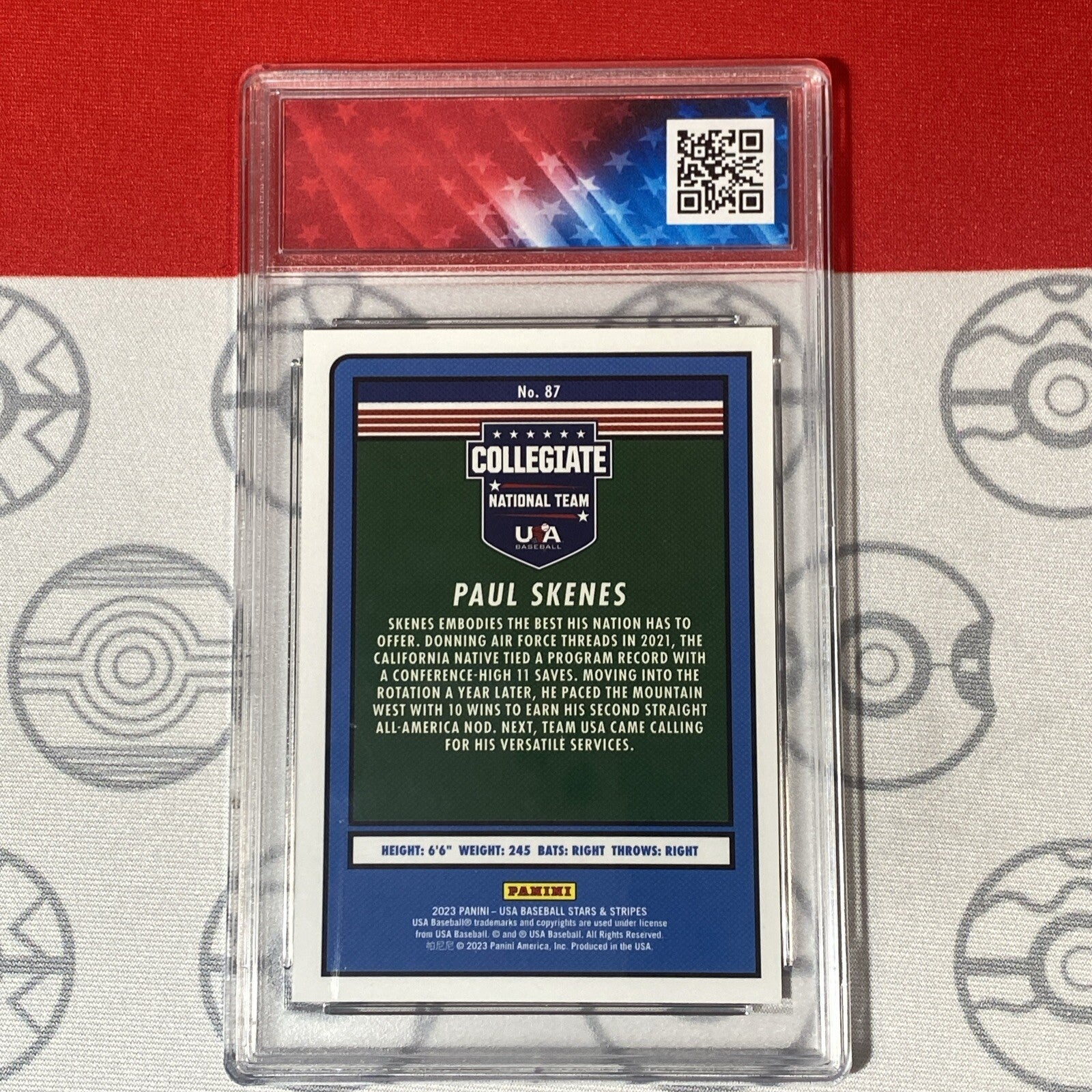 This sports trading card is an excellent addition to any collection, especially for fans of the Major League Baseball. The card is in standard size and is an English language card manufactured in the United States by Panini. It is a rookie card for Paul Skenes, and it would be an excellent investment to add this card to your collection.