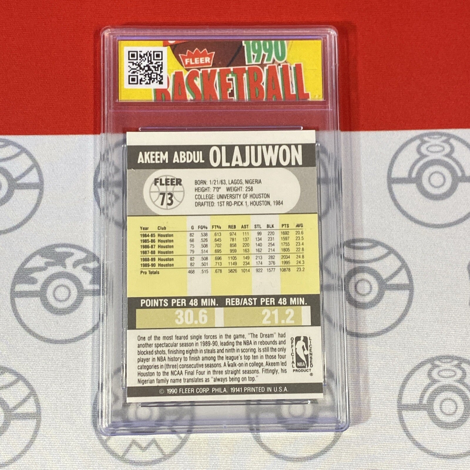 This is a rare and valuable 1990 Fleer sports trading card featuring Akeem Olajuwon of the Houston Rockets. The card is graded a perfect 10 and is a must-have for any basketball fan or collector. It is part of the 1990 Fleer set and has the card number 188, making it a highly sought-after item.
