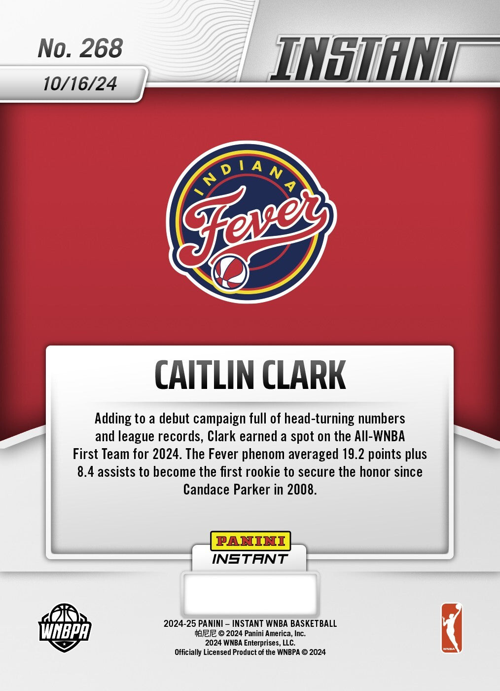 Graded 10 Caitlin Clark #268 RC Rookie Card WNBA All Team 2024 Panini Instant Basketball