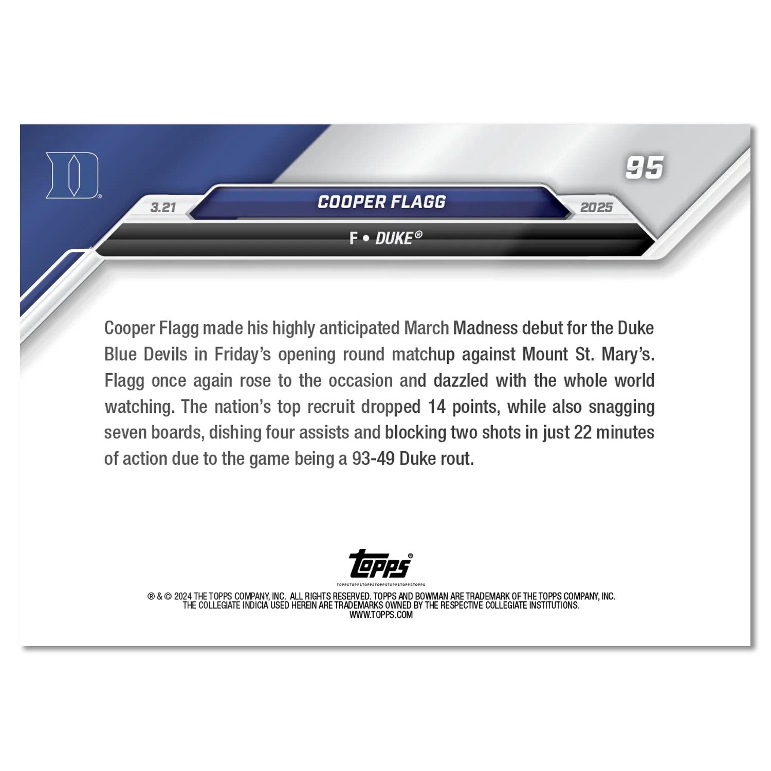 The product is a graded 10 Cooper Flagg #9 NCAA Debut Duke RC Rookie trading card from the 2024-25 Bowman set. This basketball card features Cooper Flagg, a player from the Duke Blue Devils, as he makes his NCAA debut. The card is a rookie variety, making it a sought-after collectible item for fans and collectors of sports trading cards. With its high grade and association with a popular college basketball team, this card is sure to be a valuable addition to any collection.