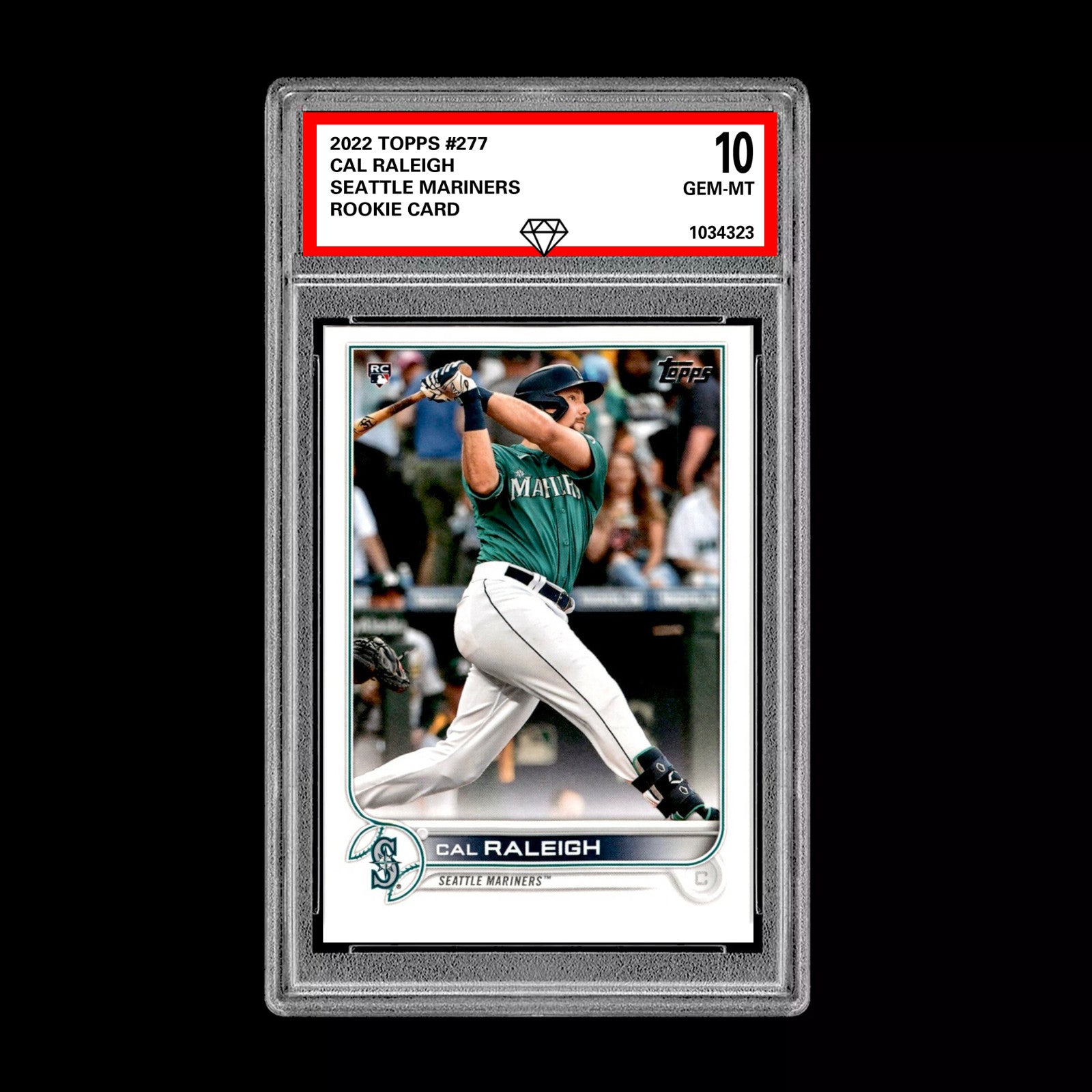 The product is a highly graded 10 Cal Raleigh rookie card from the 2022 Topps baseball set. This sports trading card features the player from the Seattle Mariners, with card number 277. It is a collectible item that represents a piece of Major League Baseball history, specifically from the 2022 season. Produced by Topps in the United States, this card is sought after by fans and collectors looking to add a valuable piece to their sports memorabilia collection.