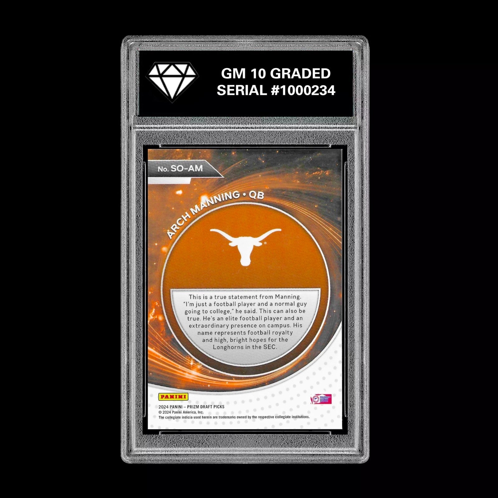 The product is a highly graded 10 Arch Manning 2024 Panini Prizm Draft Picks #SO-AM trading card. This sports trading card features a rookie player from the Texas Longhorns in the National Collegiate Athletic Association (NCAA) football league. Manufactured by Panini in the United States, this Prizm parallel variety card is a highly sought-after collectible for fans and collectors alike. With its unique features and limited availability, this card holds value for those interested in sports trading cards.