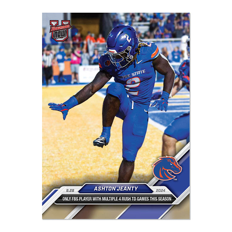 This limited edition Ashton Jeanty football trading card is a must-have for any Boise State Broncos fan. The card features the rookie player in his national collegiate athletic association (NCAA) debut season, with a standard size and card number of 20. Manufactured by Bowman, this sports trading card is part of the 2024 Bowman set and is perfect for any collector looking to add to their collection.