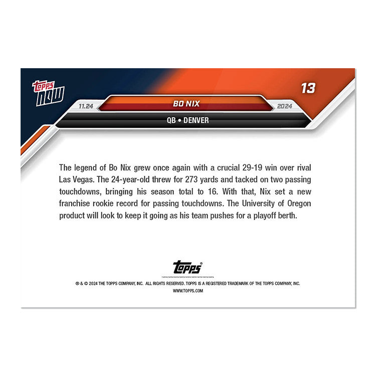 This is a rare opportunity to own a 2024 Topps Now football trading card featuring Bo Nix, the talented rookie from the Denver Broncos. The card is made of high-quality card stock with a thickness of 16 Pt. and comes in the standard size.