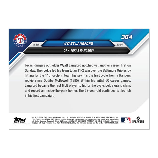 This is a limited edition pre-sale Wyatt Langford 2024 MLB Topps Now® card #330, featuring the rookie cycle ranger from the Arizona Diamondbacks. The card is from the 2023 Bowman set and is a white parallel/variety. It is a sports trading card for baseball and football enthusiasts, especially fans of the Major League (MLB).