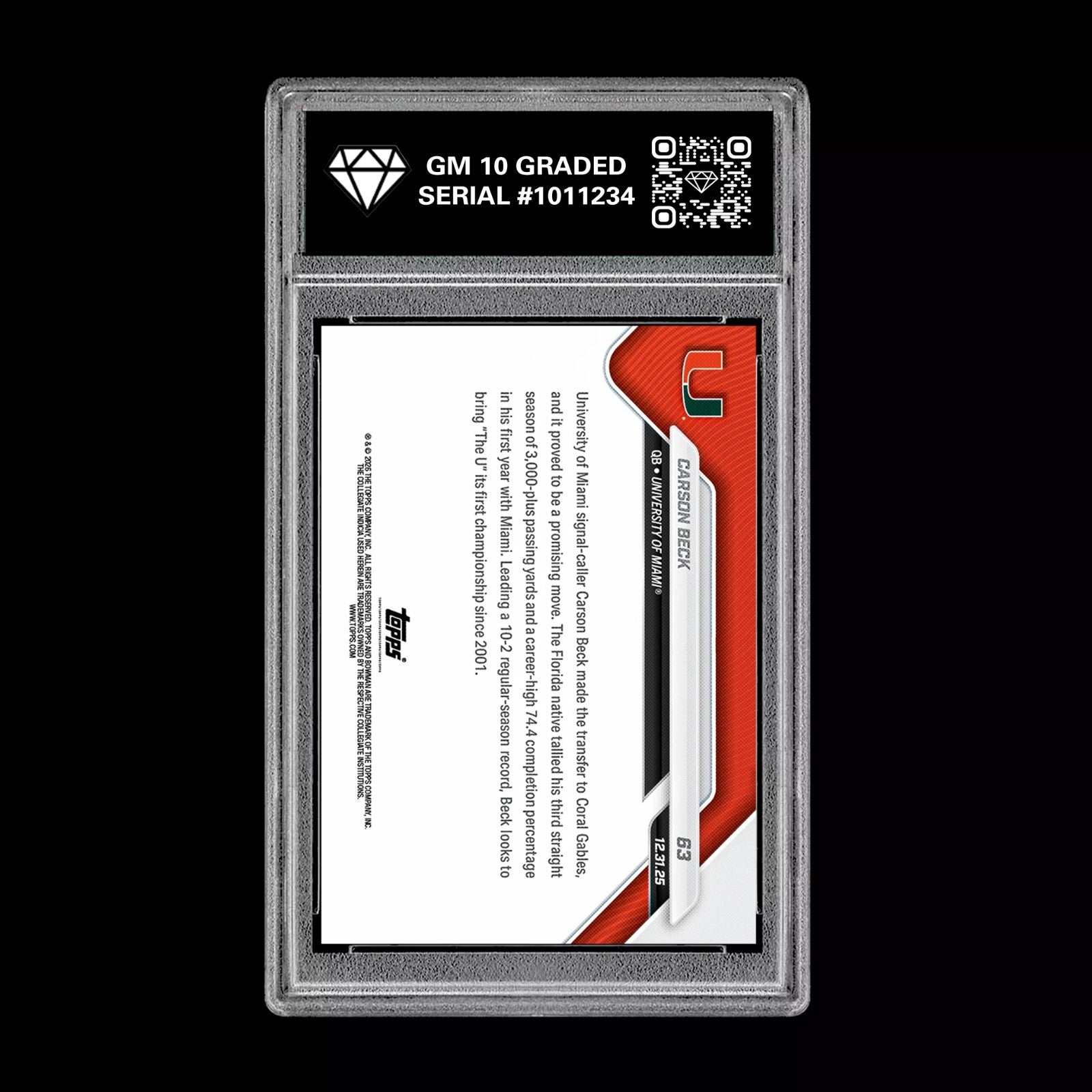 Graded 10 Carson Beck 2025-26 Bowman U Now #63 Miami Hurricanes PRESALE Football