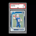 The product is a 2024 Panini Donruss Optic Rated Rookie trading card featuring football player Drake Maye. This card is a part of the base set and includes features such as being a parallel/variety card. It is a standard-sized card made of card stock with a thickness of 20 Pt. The card is not autographed and does not have a label or sticker autograph format. It is an original print and not a reprint, and it is in English language. The card belongs to the National Football League (NFL) and represents the New England Patriots team.