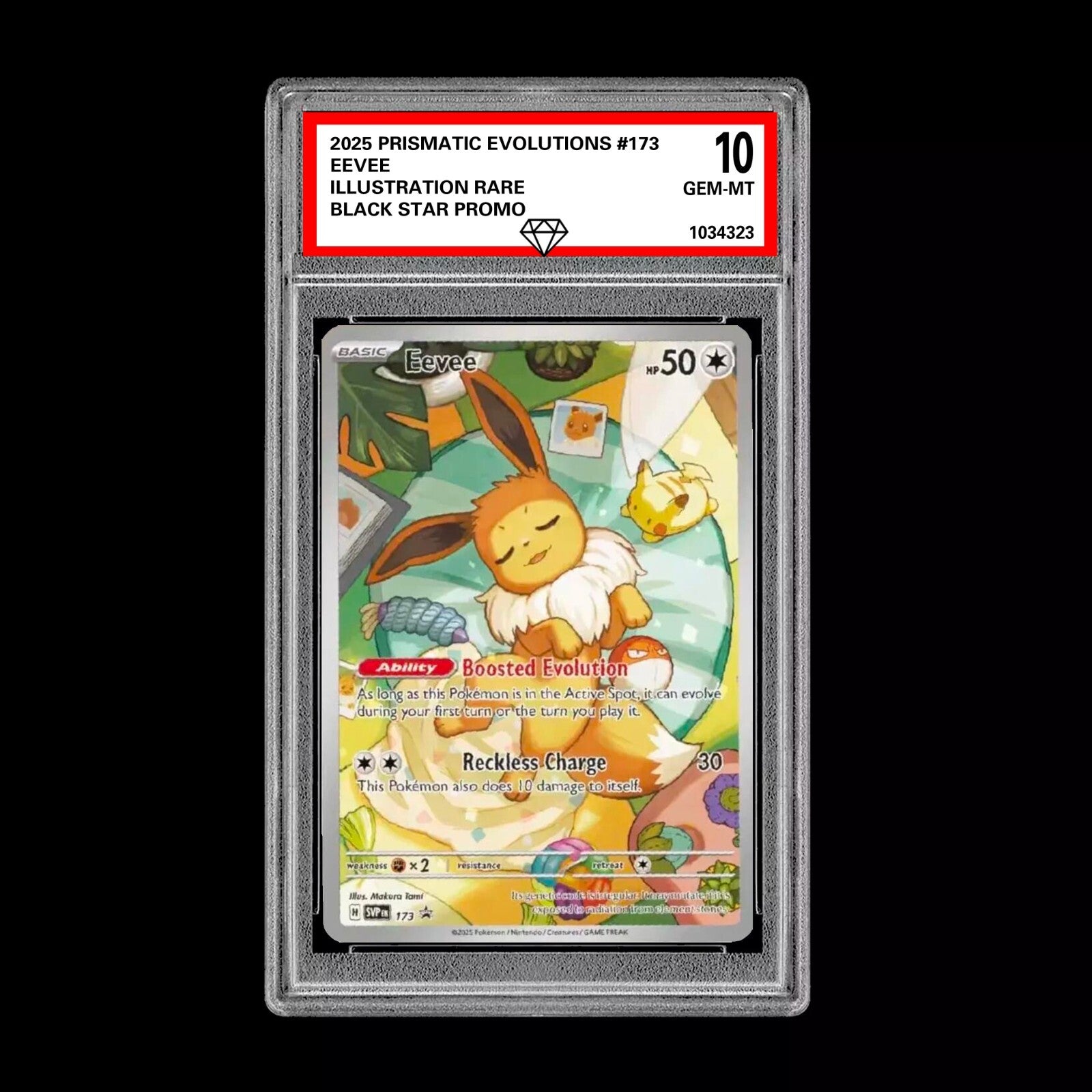 The GM Graded 10 Eevee SVP 173 Elite Trainer Box Promo Pokemon Prismatic Evolutions card is a Colorless, Basic stage Pokémon card featuring Eevee with 50 HP. It is from the Sv: Scarlet & Violet Promo Cards set, manufactured in 2024 by The Pokémon Company. This holo card is part of the Pokémon TCG game and is in English, illustrated by Makura Tami. With a rarity of Promo and a card number of 173, it is a chase card included in the Elite Trainer Box.