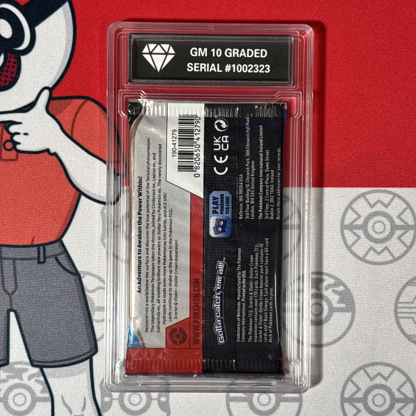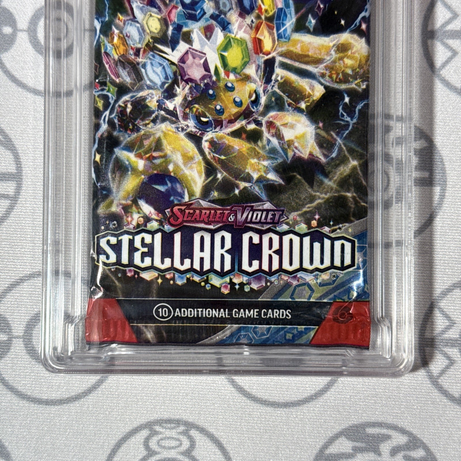 The product is a 2024 Stellar Crown Sealed Pokemon Booster Pack featuring the character Galvantula. This pack has been graded as a perfect 10 and includes exclusive art work. Manufactured by The Pokemon Company in the United States, this English-language pack contains one standard-sized card made of card stock. Perfect for collectors and fans of the Pokémon TCG, this booster pack is a valuable addition to any collection.