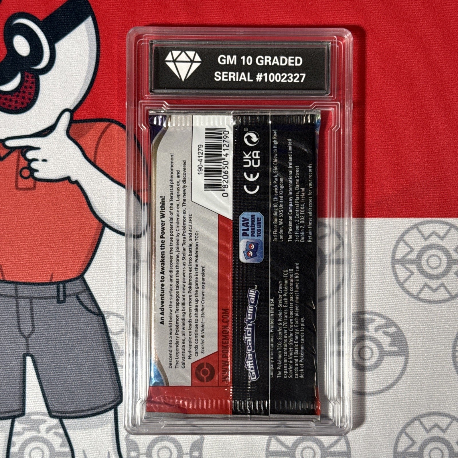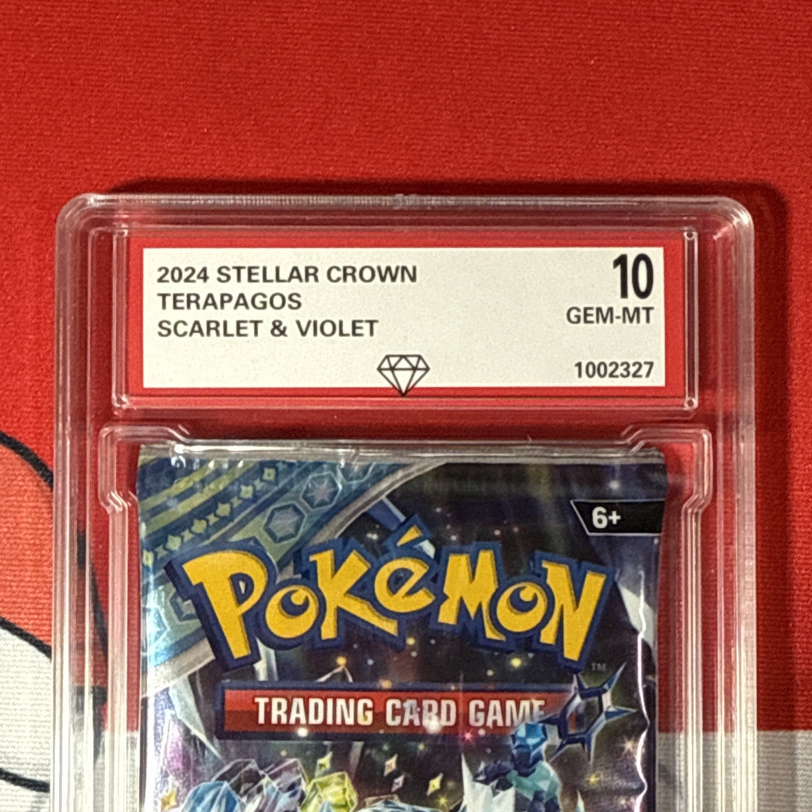 The product is a graded 10 2024 Stellar Crown Sealed Pokemon Booster Pack featuring the character Terapagos. This pack contains one standard-sized card made of card stock, manufactured by The Pokemon Company in the United States. The pack is part of the Pokémon TCG set and is designed for ages 6 and up. With English language text and booster features, this collectible card game item is a valuable addition to any collector's inventory.