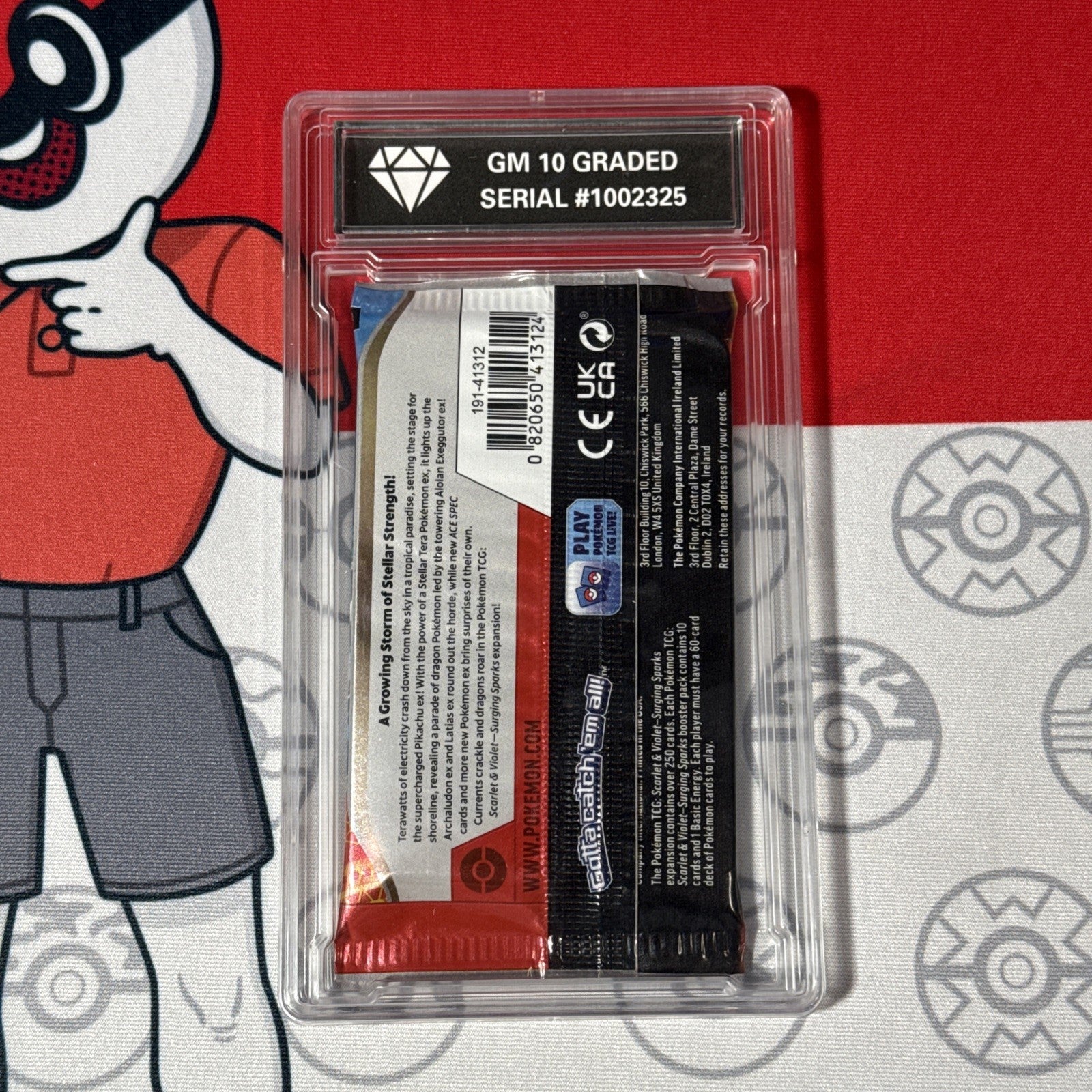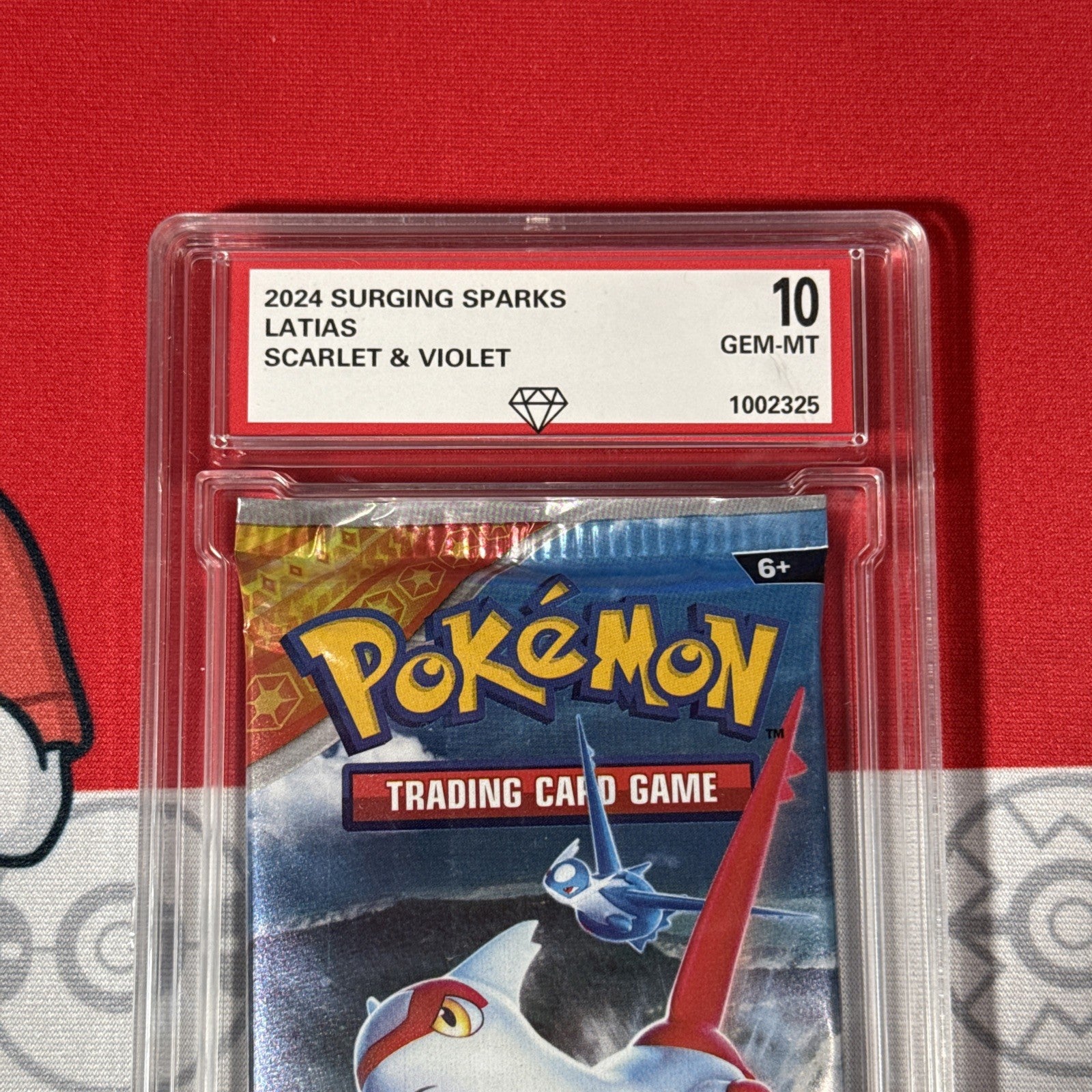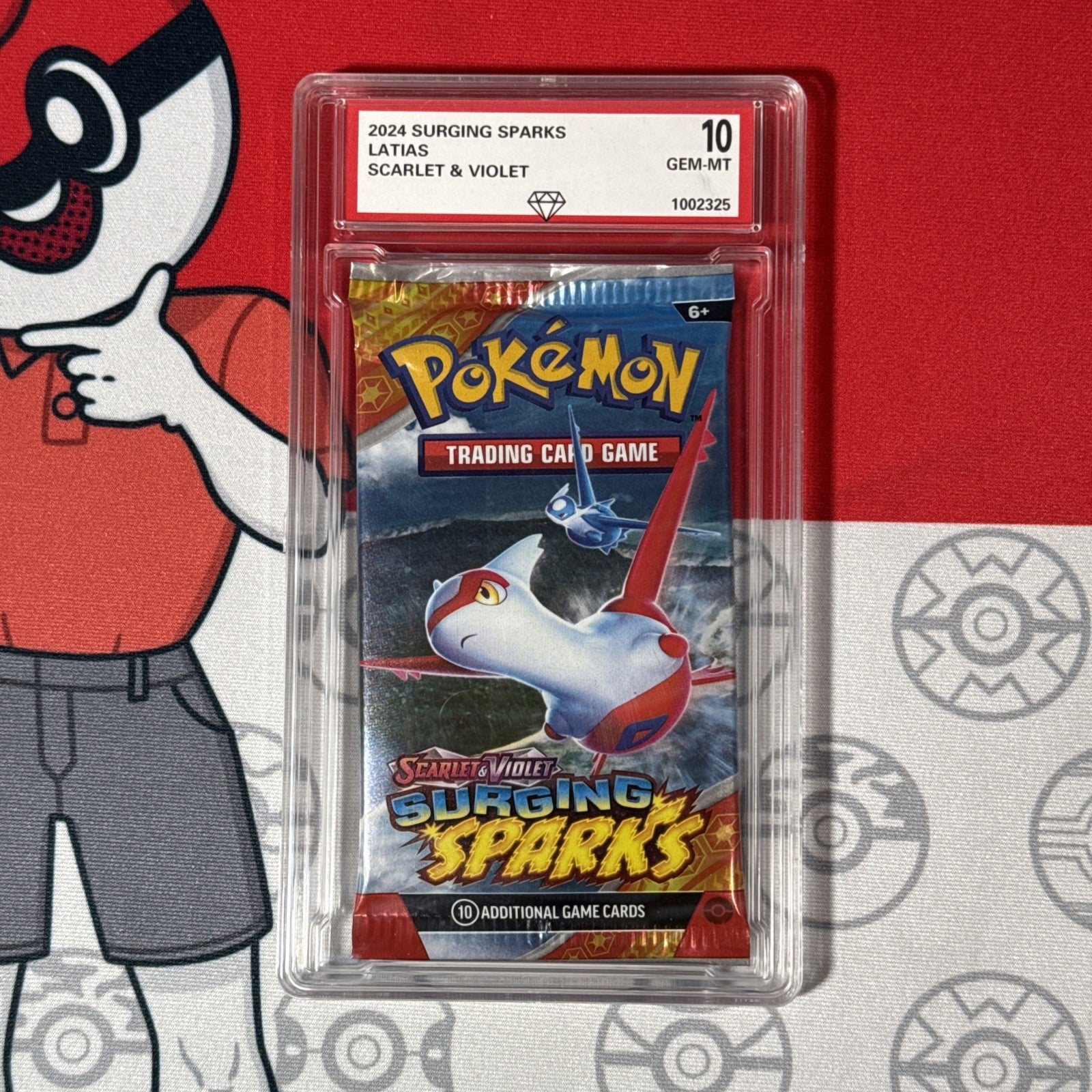 The product is a graded 10 2024 Surging Sparks Sealed Pokemon Booster Pack featuring Latias artwork. This pack contains one standard-sized card made of card stock, manufactured by The Pokemon Company in the United States. The pack is part of the Surging Sparks set and is suitable for ages 6 and up. The booster pack is in English and is perfect for collectors of Pokémon TCG cards.