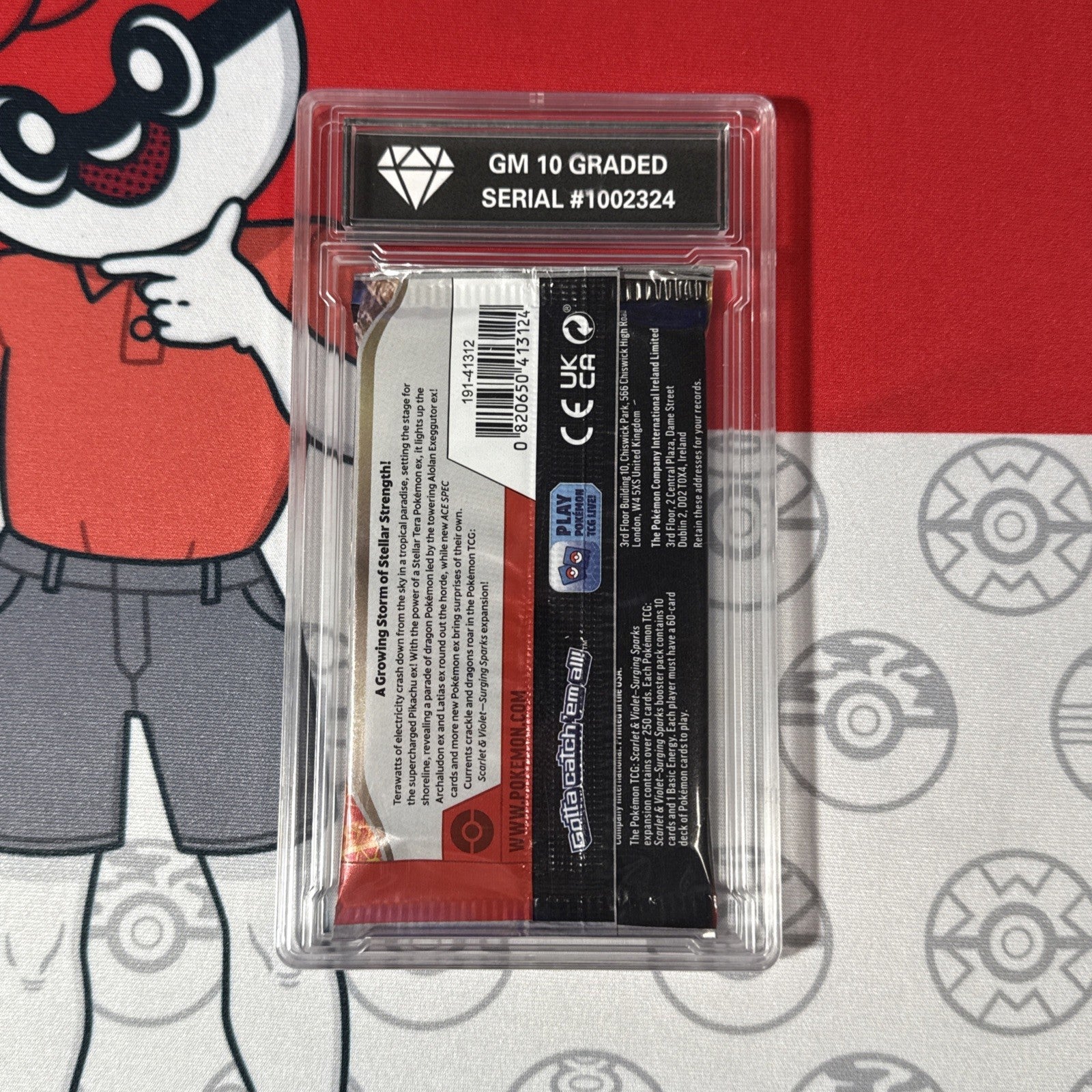 The product is a graded 10 2024 Surging Sparks Sealed Pokemon Booster Pack featuring Pikachu artwork. This pack includes one standard-sized card made of card stock, suitable for ages 6 and up. Manufactured by The Pokemon Company in the United States, this English-language pack is a part of the Pokémon TCG game. It is a collector's item for fans of the franchise looking to add a rare and valuable card to their collection.