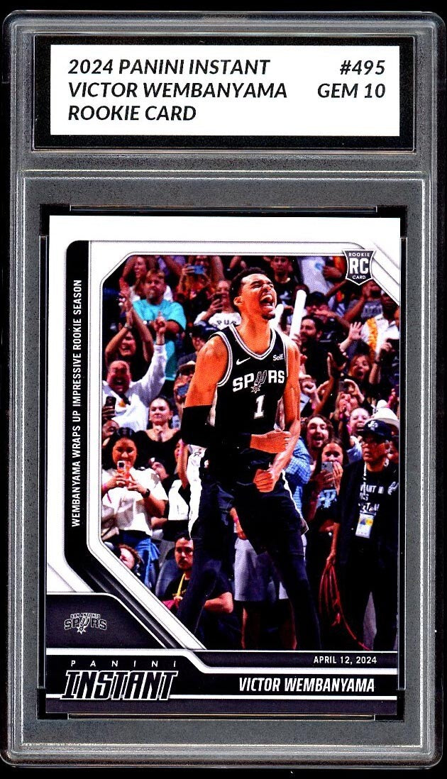 This is a rare opportunity to own a 2023-24 Panini Instant Graded 10 NBA Rookie Card RC #495 of Victor Wembanyama. This card features the San Antonio Spurs player and is made of 20 Pt. card stock material. It is an original Panini product and comes with English language and base parallel/variety.