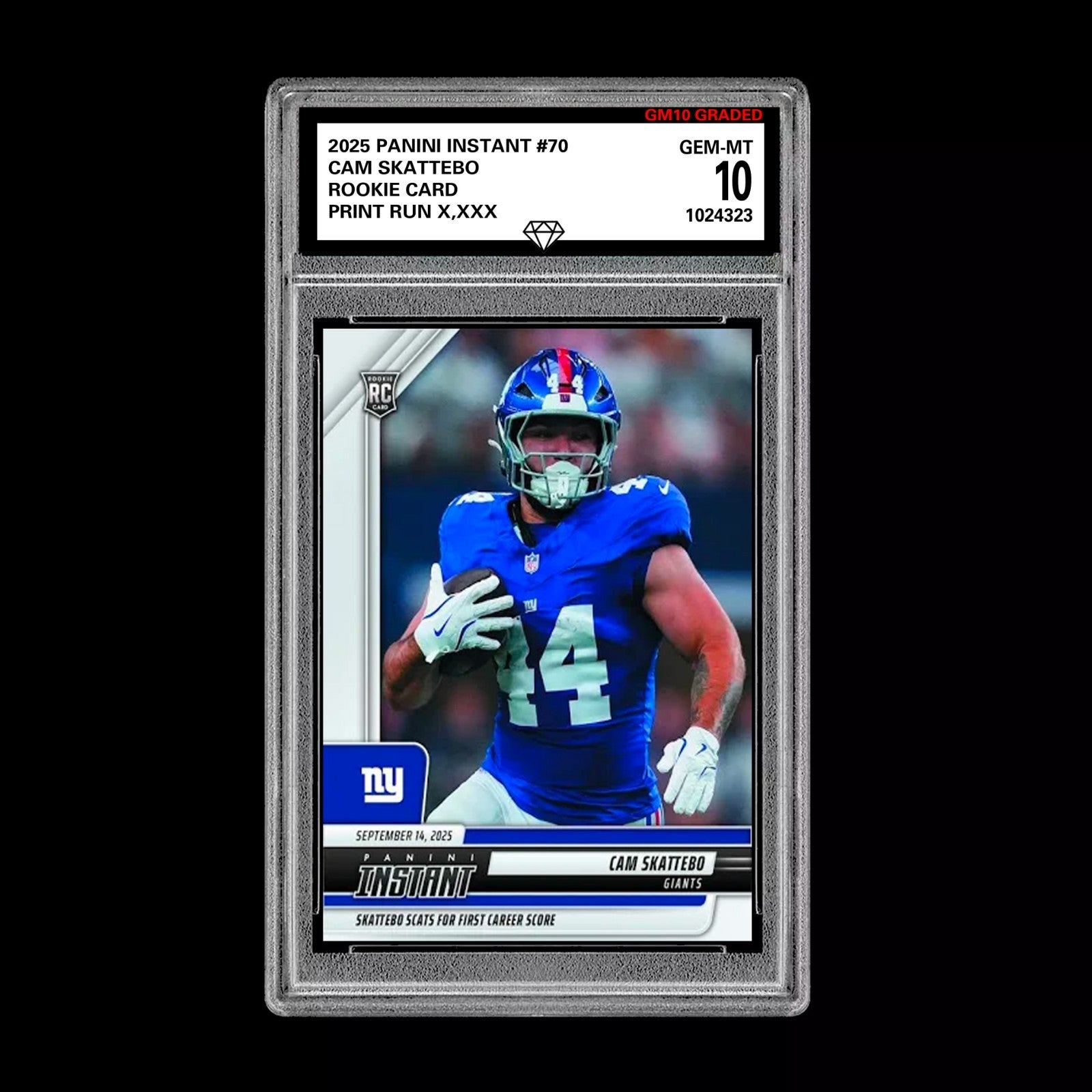 The GM10 Graded 10 CAM SKATTEBO RC ROOKIE SP 2025 Panini Instant NFL #70 trading card is a sought-after collectible featuring the rookie player CAM SKATTEBO of the New York Giants. This original card, manufactured by Panini, is part of the 2025 Panini Instant set and showcases the player in his NFL Preseason uniform. With a 20 Pt. thickness and made of card stock material, this English-language sports trading card is a valuable addition to any football card collection. The limited print run and short print status make this card highly desirable for fans and collectors alike.