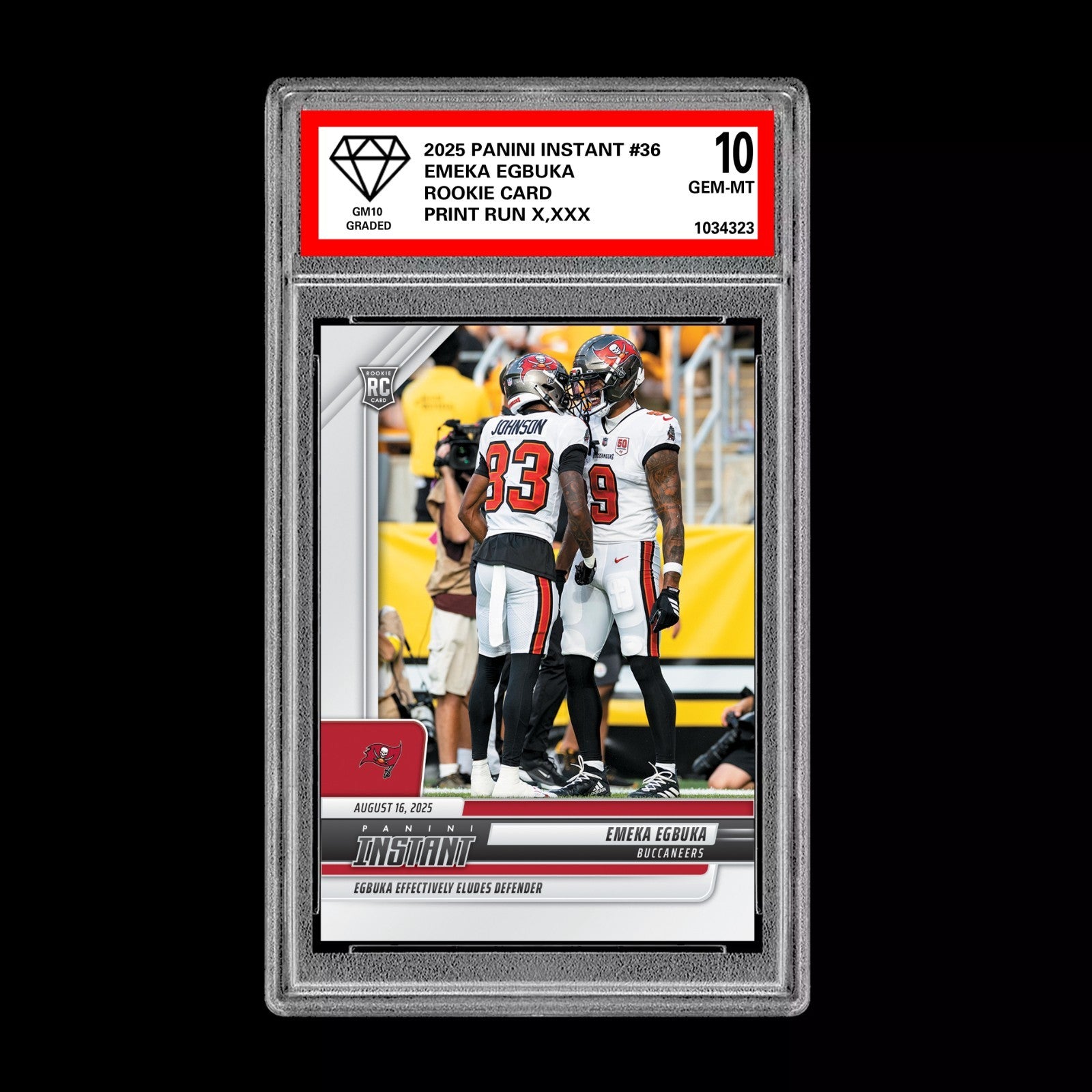 The GM10 Graded 10 Emeka Egbuka RC ROOKIE SP 2025 Panini Instant NFL #36 presale trading card is a highly sought-after collectible item featuring Emeka Egbuka, a rookie player from the Tampa Bay Buccaneers. This original sports trading card is part of the 2025 Panini Instant set and is a short print with a print run yet to be determined. Made of card stock and manufactured by Panini, this English-language card is a valuable addition to any football card collection, especially for fans of the NFL and rookie card enthusiasts.