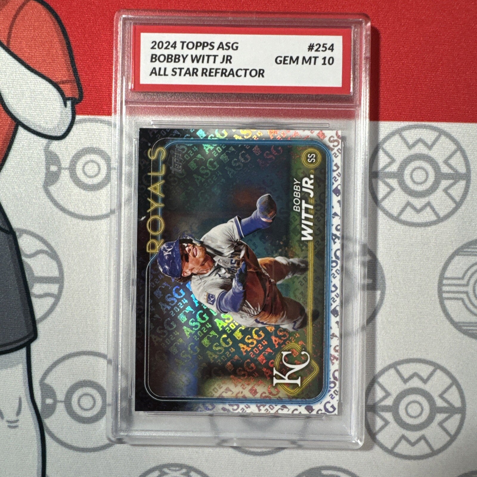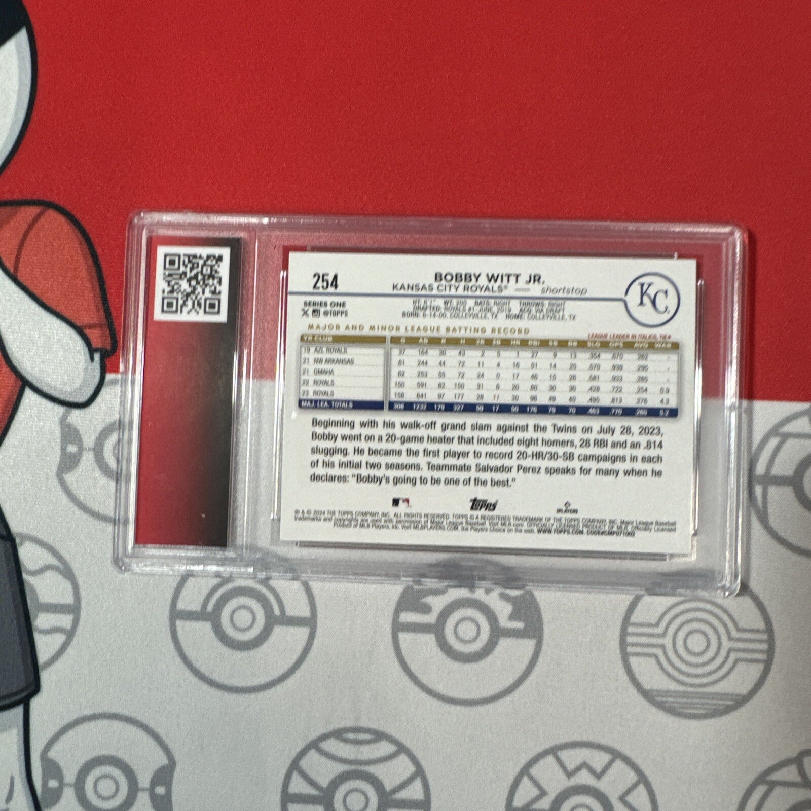 This is a rare and highly sought-after 2024 Topps Now baseball trading card featuring the Kansas City Royals' star player, Bobby Witt Jr. The card is a limited edition, short print, stamped and exclusive card. It is a single card from the set and is not autographed. The card number is 254 and it is an original card from the manufacturer, Topps.