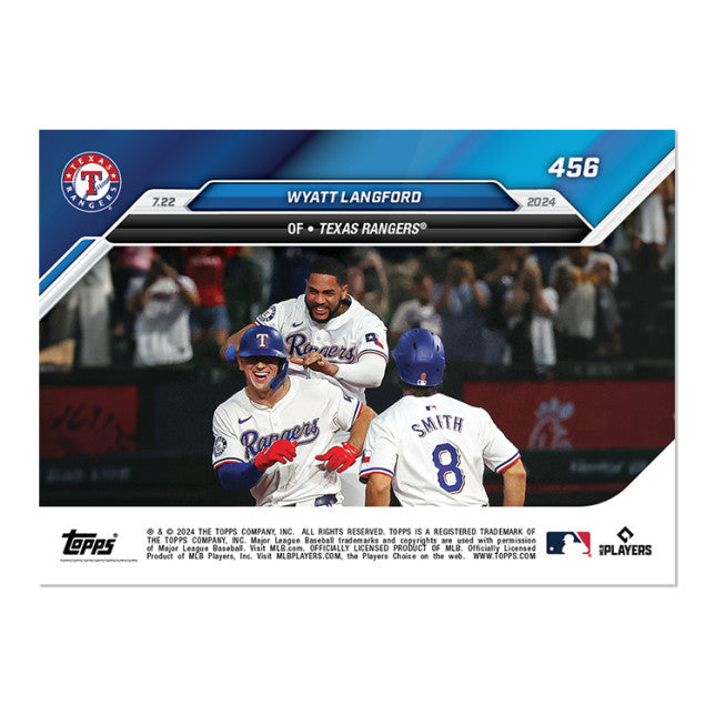 This is a pre-sale Wyatt Langford #456 2024 MLB TOPPS NOW card, featuring the rookie player for the Texas Rangers. The card is manufactured by Topps and is a sports trading card type, with aspects including baseball, football, and the Major League (MLB) league. It also features the player's team, the Rangers, and his card number.