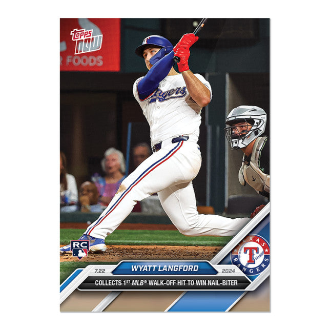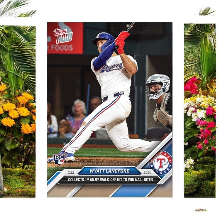This is a pre-sale Wyatt Langford #456 2024 MLB TOPPS NOW card, featuring the rookie player for the Texas Rangers. The card is manufactured by Topps and is a sports trading card type, with aspects including baseball, football, and the Major League (MLB) league. It also features the player's team, the Rangers, and his card number.
