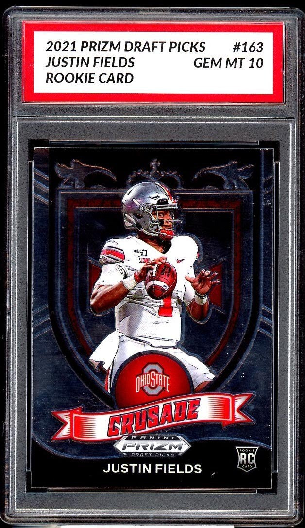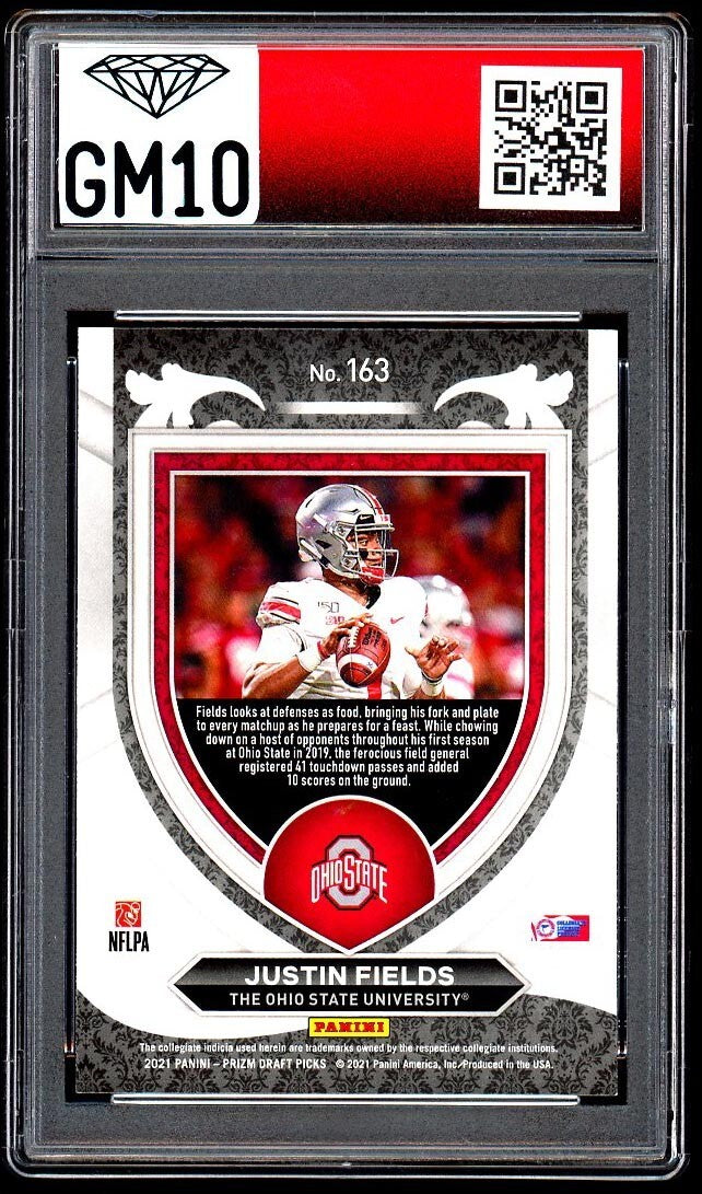 This is a rare and highly sought-after sports trading card featuring Justin Fields, the draft pick from the Ohio State Buckeyes and current player for the Chicago Bears. The card is made of high-quality card stock with a thickness of 35 Pt. and has been graded a perfect 10 by GM10. It is an original and licensed reprint from the 2021 Panini Prizm Draft Picks set, with a silver prizm parallel/variety.