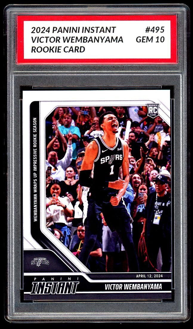 This is a rare opportunity to own a 2023-24 Panini Instant Graded 10 NBA Rookie Card RC #495 of Victor Wembanyama. This card features the San Antonio Spurs player and is made of 20 Pt. card stock material. It is an original Panini product and comes with English language and base parallel/variety.